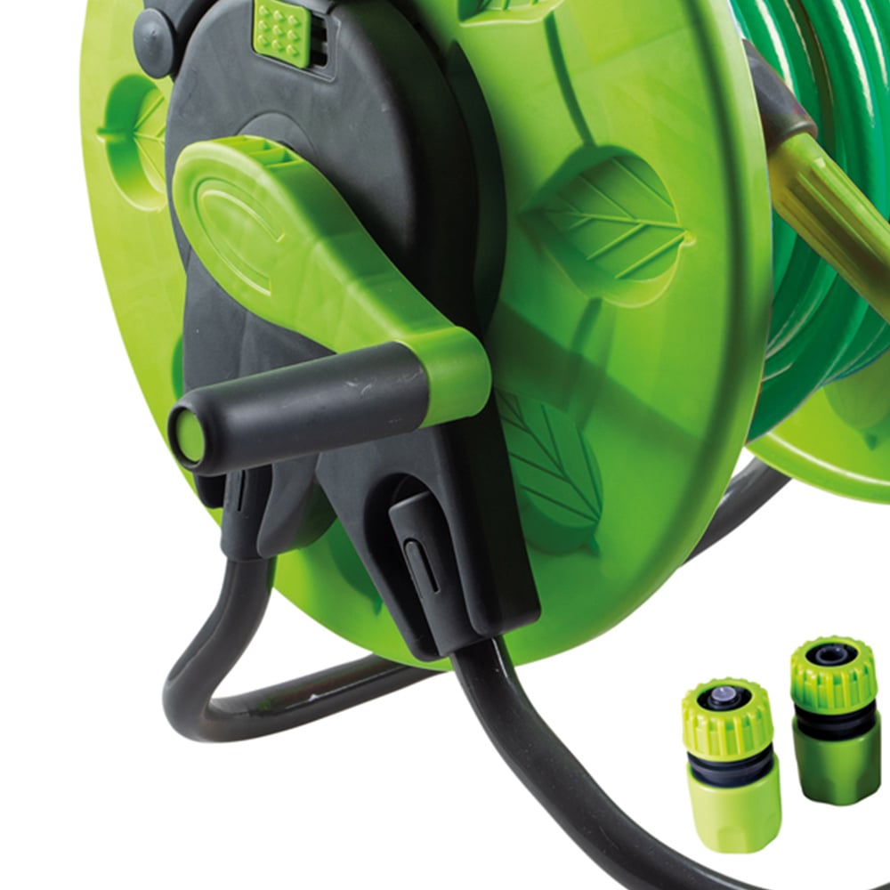Tame your garden hose with ease using this 30m Hose Cart. Designed to prevent kinks and tangles, this hose reel features a smooth manual winder for quick and easy rewinding. Its wide base and low centre of gravity provide excellent stability during use, while the robust combination of plastic and metal offers long-lasting durability. This all-in-one watering solution includes a 30m hose, indoor/outdoor tap adaptor, three hose end connectors, a water stop connector, and an adjustable spray nozzle—everything you need for hassle-free garden watering.